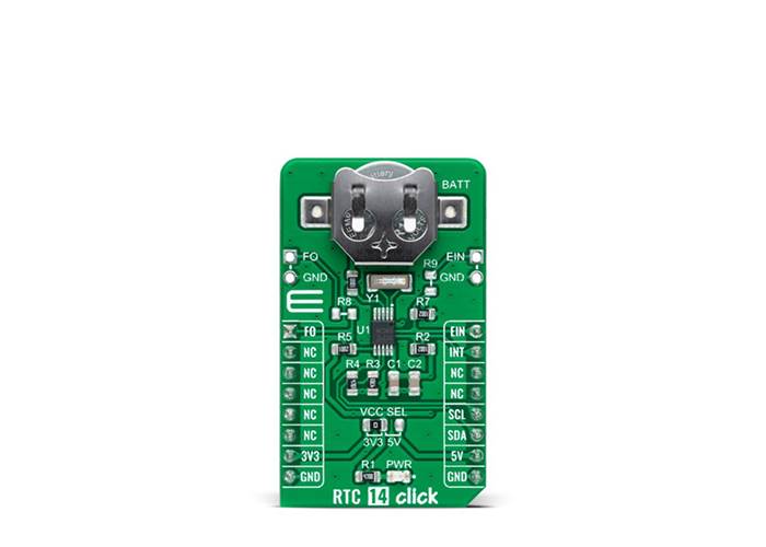 RTC 14 Click communicates with MCU using the standard I2C 2-Wire interface to read data and configure settings, supporting a Fast Mode operation up to 400kHz. Also, it has the frequency output programmable from 32.768kHz to 1/32Hz, available at the PWM pin of the mikroBUS™ socket and onboard header pin labelled as FO. This feature is used for various timing applications, including clocking the MCU in sleep mode, eliminating external crystal, and further reducing the BOM. To use features such as external event input or frequency output available on onboard headers, it is necessary to populate the resistors R8 and R9 and thus activate these functions on the headers.
