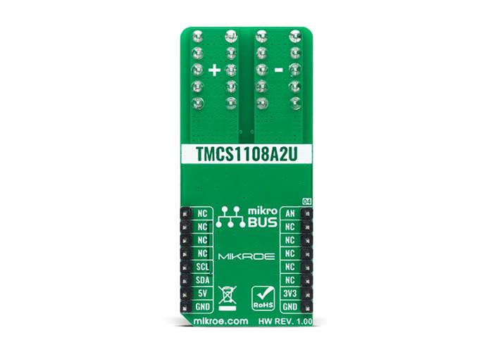 Hall Current 11 Click as its foundation uses the TMCS1108A2U, a precision Hall-effect current sensor, featuring a 100V functional isolation working voltage, <3% full-scale error across temperature, and both unidirectional and bidirectional current sensing from Texas Instruments. The input current flows through a 1.8mΩ resistance conductor between the isolated input current pins, minimising power loss and thermal dissipation. The magnetic field generated by the input current is sensed by a Hall sensor and amplified by a precision integrated signal chain. The TMCS1108A2U can be used for both AC and DC current measurements with a bandwidth of 80kHz.