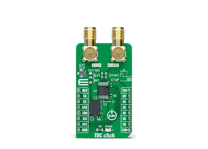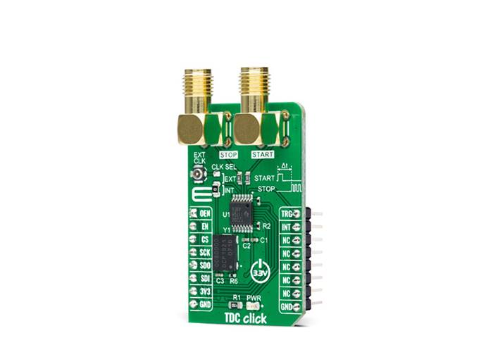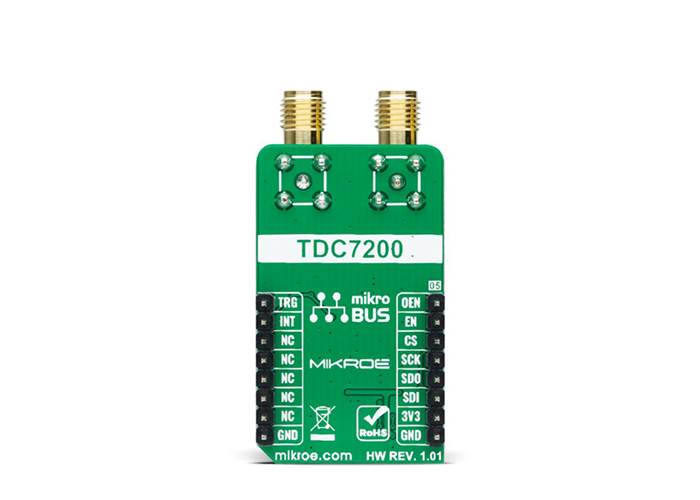 TDC Click as its foundation uses the TDC7200, a time-to-digital converter for time-of-flight (ToF) applications for LIDAR and ultrasonic from Texas Instruments. This stopwatch IC is used to measure the time between a single event known as time-of-flight (an edge on START signal) and multiple subsequent events (an edge on STOP signal), which are brought to the onboard SMA connectors marked as START and STOP. The user also can pair this Click board™ with some external board that contains the TDC1000 (ultrasonic analogue front-end) and become a part of a complete ultrasonic sensing solution for measurements such as water, petrol, and heat flow meter.
