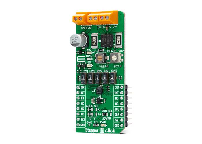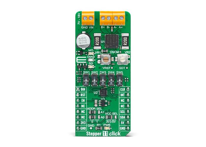 This Click board™ also has two additional LEDs for anomaly indication. Suppose a state such as a motor load open, overtemperature, or overcurrent is detected. In that case, such anomaly is indicated by a red LED marked as DIAG, while an orange LED labelled as SD indicates when a stall (step-out) situation is detected. Motor-stall detection threshold can also be set manually using an onboard trimmer labelled as VR2.
