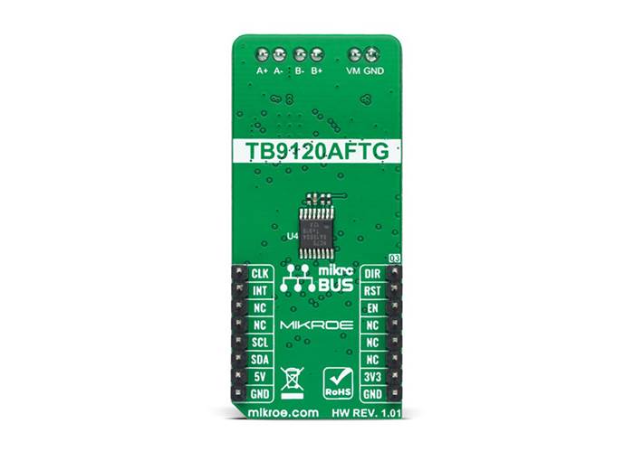 MIKROE Stepper 11 Click is a compact add-on board that contains a bipolar stepper motor driver. This board features the TB9120AFTG, a two-phase bipolar stepping motor driver with a clock input interface and a PWM constant-current control system from Toshiba Semiconductor.