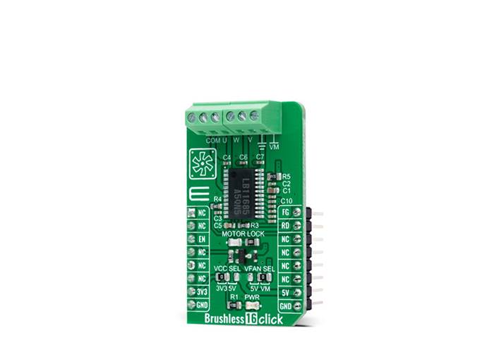 MIKROE Brushless 16 Click is a compact add-on board suitable for controlling BLDC motors with any MCU. This board features the LB11685AV, a three-phase full-wave current-linear-drive motor driver from ON Semiconductor. It adopts a sensorless control system without the use of a Hall Effect device. The LB11685AV features a current soft switching circuit for quieter operation and is optimal for driving the cooling fan motors used in refrigerators. It also comes with several protection features such as motor lock, thermal shutdown, current limit, beat lock detection, and more. This Click board™ makes the perfect solution for use in home appliances such as air-conditioner and cooling fans, air purifiers, and industrial equipment.