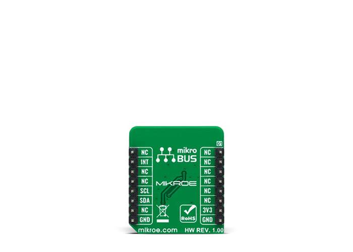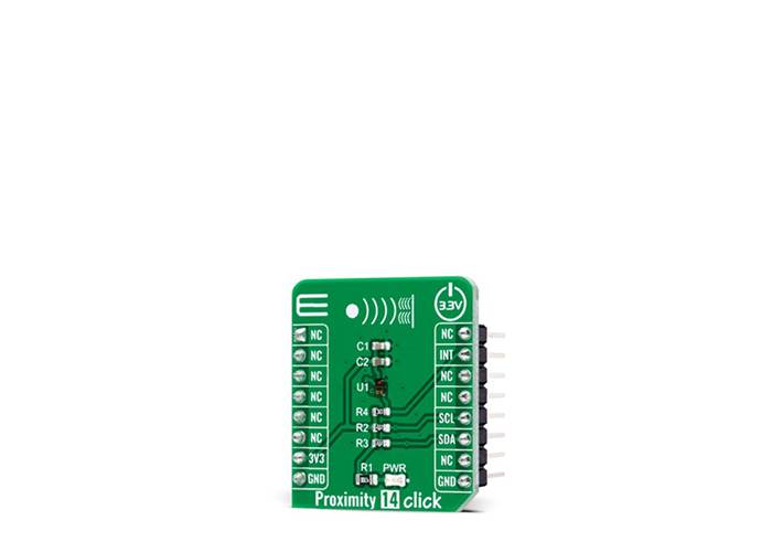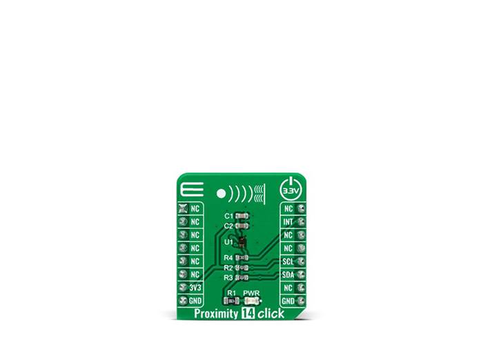 Proximity 14 Click as its foundation uses the VCNL36825T, a new fully integrated proximity sensor designed to increase efficiency and performance in consumer and industrial applications from Vishay Semiconductors. Featuring a vertical-cavity surface-emitting laser (VCSEL), the VCNL36825T combines a photodiode, signal processing IC, and 12-bit ADC in a compact SMD package, with a small 1.6mm light hole. With a range of 20cm, it also provides collision detection and features low power consumption down to 6.63µA to increase efficiency in these applications.