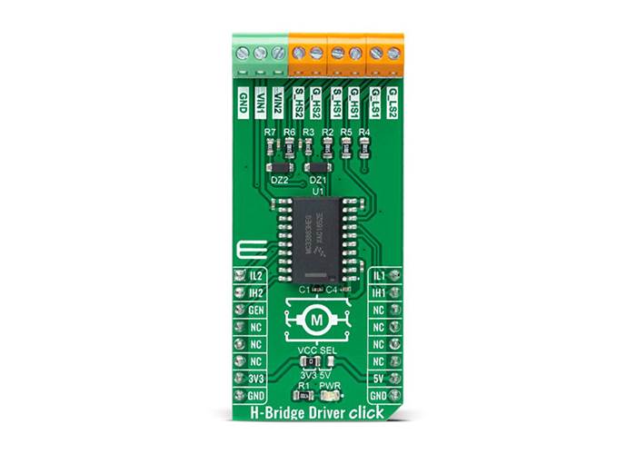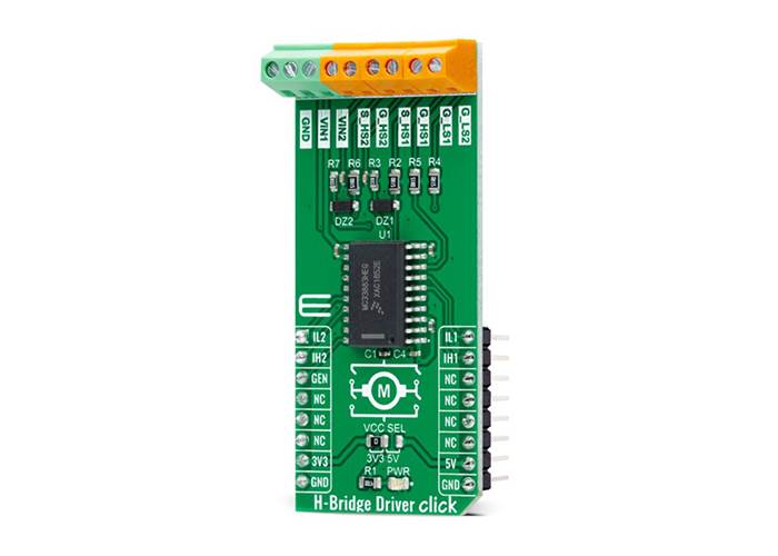 MIKROE H-Bridge Driver Click is a compact add-on board that contains an H-bridge gate driver, also known as a full-bridge pre-driver.