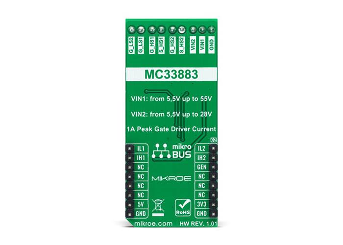 MIKROE H-Bridge Driver Click is a compact add-on board that contains an H-bridge gate driver, also known as a full-bridge pre-driver. This board features the MC33883, an H-Bridge gate driver with an integrated charge pump and independent high and low side gate drive channels from NXP Semiconductors. The gate driver channels are independently controlled by four separate input pins, allowing the device to be optionally configured as two independent high side gate drivers and two independent low side gate drivers. Gate driver outputs can source and sink up to 1.0A peak current pulses, permitting large gate-charge MOSFETs to be driven and/or high pulse-width modulation (PWM) frequencies to be utilised. This Click board™ is suitable for automotive engine applications (electric pumps), energy storage systems (ESS), uninterruptible power supply (UPS), and more.