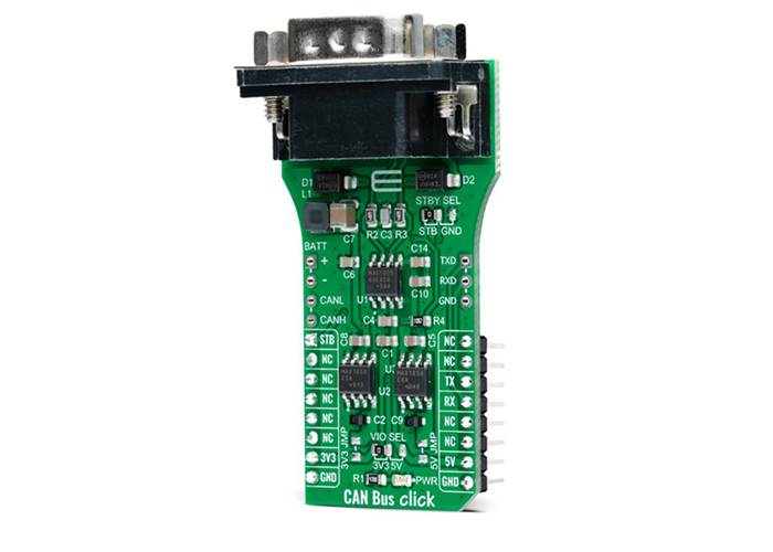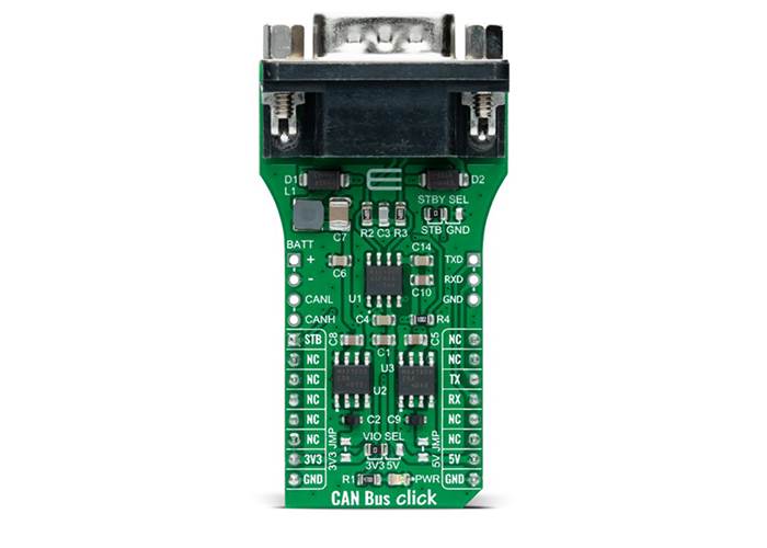 CAN Bus Click is a compact add-on board that provides a link between the CAN protocol controller and the physical wires of the bus lines in a control area network (CAN).