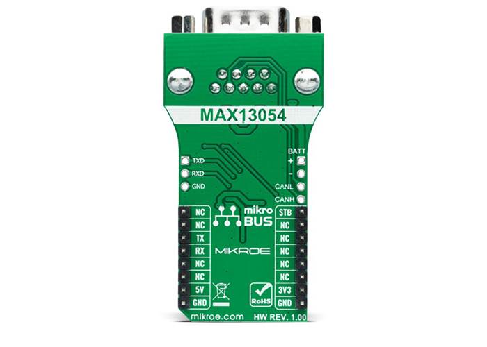 The MAX13054 communicates with MCU using the UART interface with the default baud rate of 115200 bps for the data transfer. In addition to UART communication pins from the mikroBUS™ socket, the user can connect the TX/RX signals directly through the UART External header on the right edge of the board. This Click board™ comes equipped with the standard DB-9 connector, making interfacing with the CAN bus simple and easy. Besides, the user can connect the CAN signals directly through the CAN External header, also on the left edge of the board.
