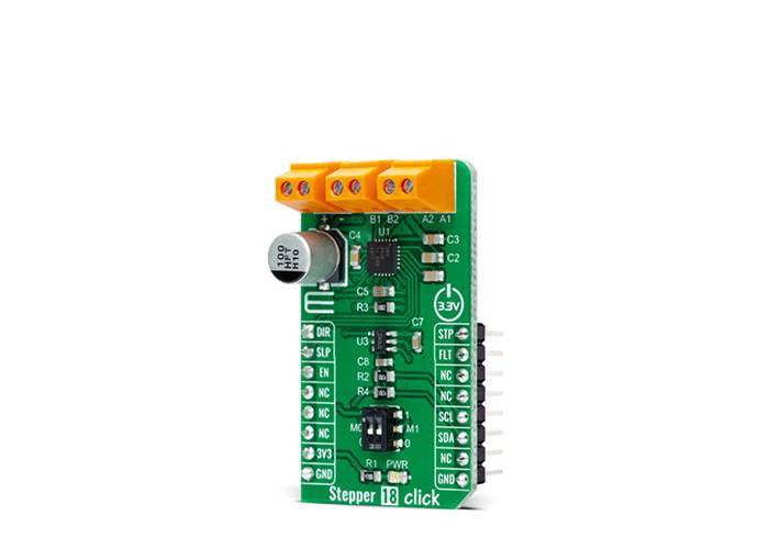 Stepper 18 Click is a compact add-on board that contains a microstepping stepper motor driver. This board features the DRV8426, a stepper motor driver for industrial and consumer applications from Texas Instruments. It is fully integrated with two N-channel power MOSFET H-bridge drivers, a microstepping indexer, and integrated current sensing capable of driving up to 1.5A full-scale output current. A simple STEP/DIR interface allows managing the direction and step rate of the stepper motor up to 1/256 microstepping. This Click board™ is suitable for driving motors in any application that demands a precise and safe step motor driver.