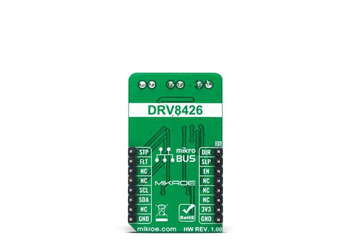 Stepper 18 Click as its foundation uses the DRV8426, an integrated motor-driver solution for bipolar stepper motors with integrated current sense, 1/256 microstepping, STEP/DIR interface, and smart-tune technology Texas Instruments. It provides the maximum integration by integrating two N-channel power MOSFET H-bridges, current sense resistors and regulation circuitry, and a microstepping indexer capable of driving up to 1.5A full-scale output current.