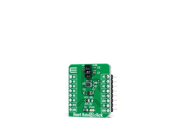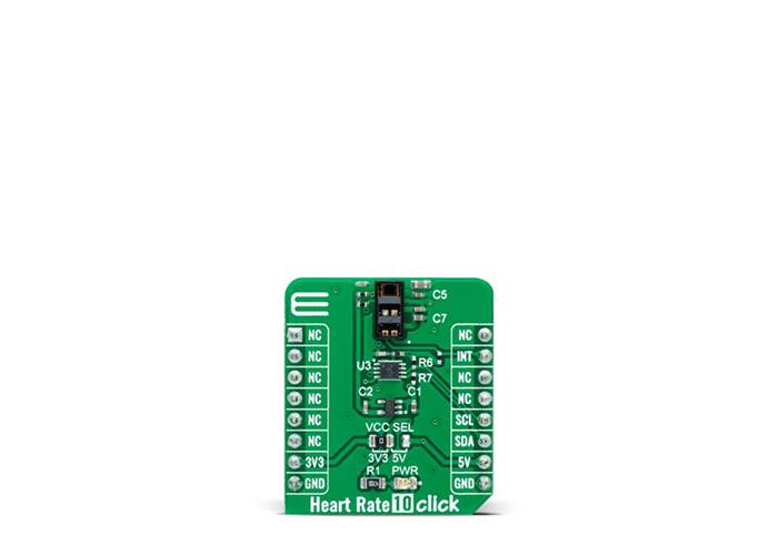 Heart Rate 10 Click communicates with MCU using the standard I2C 2-Wire interface with a maximum clock frequency of up to 400kHz. It is fully adjustable through software registers, and the digital output data is stored in a 32-deep FIFO within the device. Since the sensor for operation requires a power supply of 1.8V, this Click board™ also features the PCA9306 voltage-level translator from Texas Instruments. The I2C interface bus lines are routed to the dual bidirectional voltage-level translator, allowing this Click board™ to work with both 3.3V and 5V MCUs properly.