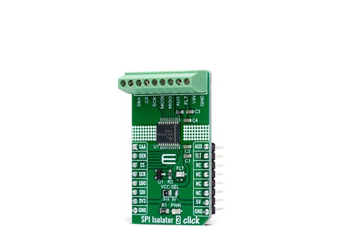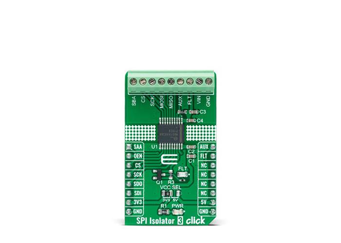 SPI Isolator 3 Click is a compact add-on board that contains a digital isolator optimised for a serial peripheral interface. This board features the MAX14483, a 6-channel 3.75kVRMS digital galvanic isolator with a very low propagation delay on the SDI, SDO, and SCLK channels from Analogue Devices. Besides a second enable control input, which allows MAX14483 to isolate multiple SPI devices, and an auxiliary channel available for passing timing or control signals from the controller side to the peripheral side, the MAX14483 also possesses power monitors provided for both power domains to signal if the opposite side of the isolator is ready for operation. Thus, this Click board™ is suitable for general SPI-bus isolation and the industrial, process, and building automation, in programmable logic controllers, and many more.