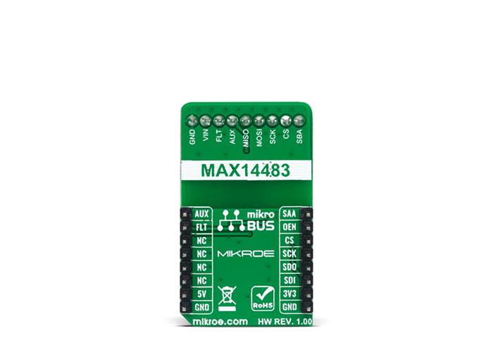SPI Isolator 3 Click as its foundation uses the MAX14483, a 6-channel 3.75kVRMS digital isolator with a very low propagation delay on the SDI, SDO, and SCLK channels from Analogue Devices. It provides galvanic isolation for digital signals transmitted between two ground domains. The device withstands up to 560Vpeak of continuous isolation and up to 3.75kVRMS for up to 60 seconds. The wide supply voltage range of both power pins allows the MAX14483 to be used for level translation and isolation.