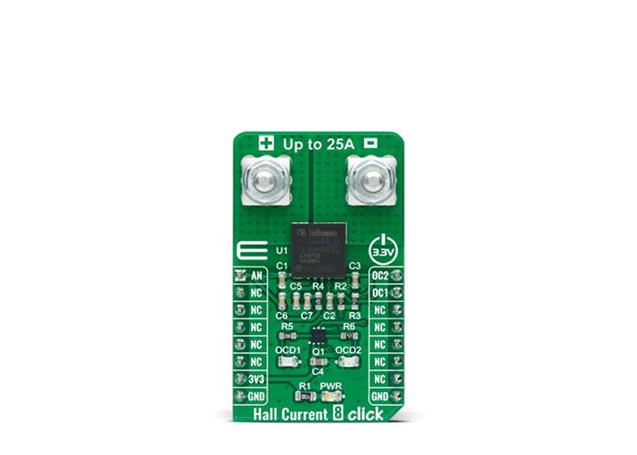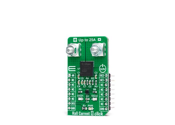 Hall Current 8 Click is a compact add-on board that contains a precise solution for AC/DC current sensing. This board features the TLI4971-A025T5, a high-precision coreless current sensor for industrial/consumer applications from Infineon Technologies. The TLI4971-A025T5 has an analogue interface and two fast overcurrent detection outputs, which support the protection of the power circuitry. Galvanic isolation is also provided according to the magnetic sensing principle. Infineon's monolithic Hall technology enables accurate and highly linear measurement of currents with a full scale up to 25A. This Click board™ is suitable for AC/DC current measurement applications: electrical drives, general-purpose inverters, chargers, current monitoring, overload, over-current detection, and many more.