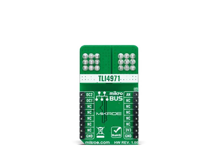Hall Current 8 Click as its foundation uses the TLI4971-A025T5, a high-precision miniature coreless magnetic current sensor for AC and DC measurements with an analogue interface and two fast overcurrent detection outputs from Infineon Technologies. The well-established Hall technology, on which the TLI4971 is based, enables accurate and highly linear measurement of currents with a full scale that depends on the chosen product variant, in this case, up to 25A. Typical applications are electrical drives and general-purpose inverters. It is suitable for fast over-current detection, which allows the control unit to switch off and protect the affected system from damage, independently from the primary measurement path.