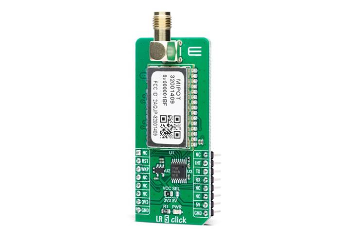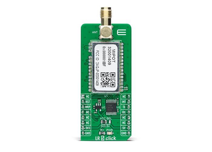 LR 5 Click is a compact add-on board that contains a long-range transceiver. This board features the 32001409, RF technology-based SRD transceiver, which operates at a frequency of 915MHz from Mipot. Thanks to the spread spectrum modulation feature, as well as the low power consumption, it is capable of achieving long-range communication, immune to interferences. It features a complete long-range stack onboard; it implements physical, network, and MAC layers, allowing for easy operation via the UART interface. This Click board™ offers an easy and reliable solution for developing highly integrated long-range IoT networks, security systems, alarm networks, and similar applications that require simple and reliable networking solutions.
