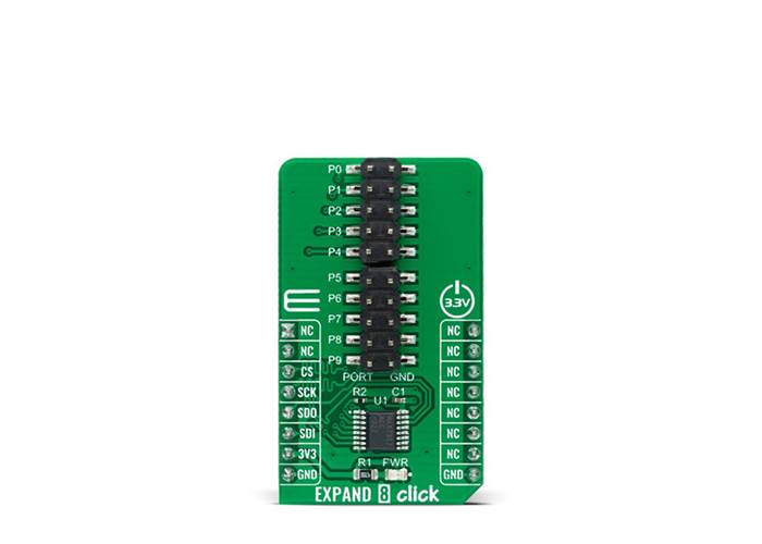 Expand 8 Click communicates with MCU through a 16-bit 4-wire serial interface compatible with standard SPI, QSPI™, MICROWIRE™ guaranteed to operate at 35Mbps on its 3.3V power supply. During the Power-Up sequence, all control registers of the MAX7317 are in a reset state. Power-Up status sets I/O ports, P0 to P9, into a high impedance state and puts the device into Shutdown mode. The I/O ports P0–P9 remains high impedance with up to 8V asserted on them when the MAX7317 is powered down. Therefore, it can be used in hot-swap applications.