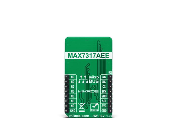 Expand 8 Click as its foundation uses the MAX7317, a general-purpose input/output (GPIO) peripheral from Analogue Devices that provides 10 I/O ports, P0 to P9, controlled through a high-speed SPI-compatible serial interface. Each port, P0 to P9 can be configured as open-drain, current-sink outputs rated at 20mA maximum, or as CMOS inputs, or as open-drain outputs. Loads should be connected to a supply voltage no higher than 7V.