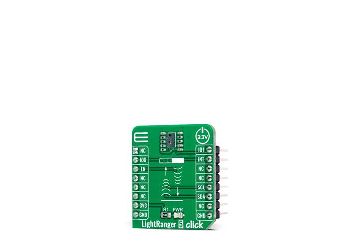 LightRanger 5 Click communicates with MCU using the standard I2C 2-Wire interface supporting Fast Mode operation with a clock frequency up to 1MHz. Also, it provides the possibility of the device Power-Up feature (Enable) routed to the CS pin of the mikroBUS™ socket, interrupt feature on the INT pin of the mikroBUS™ to optimise ranging operation, and two pins on the RST and PWM pins of the mikroBUS™ socket used as a general GPIO output signal.
