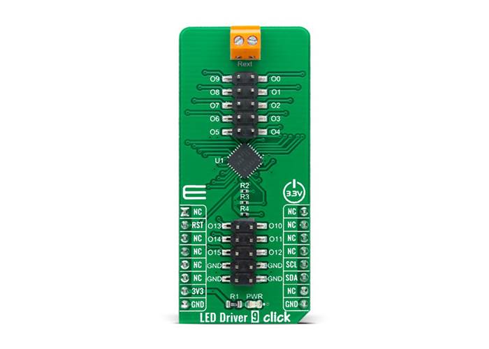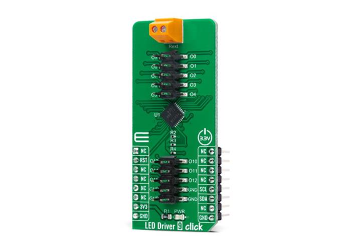 At the top of this Click board™, there is also a terminal labelled Rext used to connect an external resistor to set the LED current. The TLC59116 scales up the reference current set by the external resistor to sink the output current at each output port.