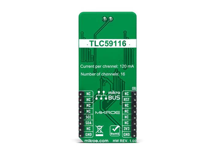 LED Driver 9 Click is a compact add-on board that simplifies the control of multiple LEDs. This board features the TLC59116, I2C bus-controlled 16-channel LED driver optimised for red/green/blue/amber (RGBA) colour mixing and backlight application from Texas Instruments.
