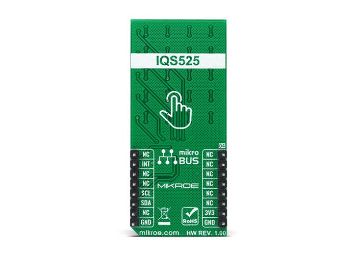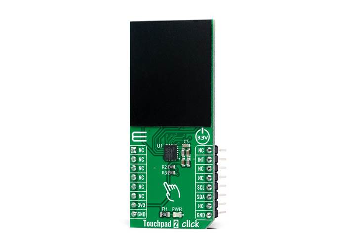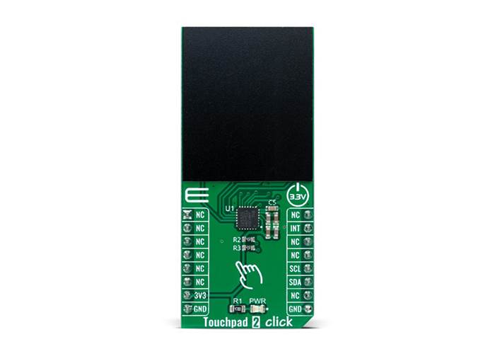 Touchpad 2 Click is a compact add-on board that easily integrates projected capacitive touch into their applications. This board features the IQS525, a projected capacitive touch and proximity trackpad/touchscreen controller from Azoteq. It features best in class sensitivity, signal-to-noise ratio, and automatic tuning of electrodes, in addition to the multi-touch and multi-hover feature. This Click board™ is characterized by embedded gesture engine recognition for simple gestures (tap, swipes, hold), as well as built-in noise detection and filtering. This Click board™ is suitable for human-machine interfaces, keypad or scrolling functions, single-finger gesture-based interfaces, and more.