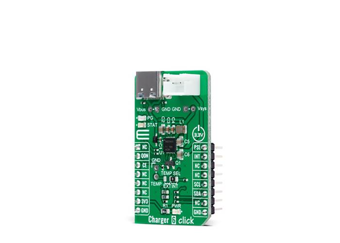 Charger 6 Click as its foundation uses the BQ25601, a fast-charging solution for single-cell Li-Ion and Li-polymer battery with high input voltage suitable for a wide range of smartphones, tablets, and portable devices from Texas Instruments. The low impedance power path optimizes switch-mode operation efficiency, reduces battery charging time, and extends battery life during discharge. It is optimised for USB 5V voltage input, has a programmable current limiting based on the built-in USB interface, and allows the use of an external power supply from 3.9 to 13.5V. The BQ25601 also meets USB On-the-Go (OTG) operation power rating specification by supplying 5.15 V on the VBUS line with a constant current limit of up to 1.2A. The device provides automatic power path selection on the SYS line from the VBUS input source, battery, or both.