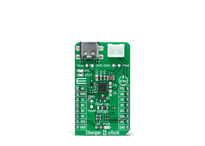 Charger 6 Click is a compact add-on board that represents a single-cell battery charger. This board features the BQ25601, an I2C controlled battery charger for high input voltage and narrow voltage DC power path management from Texas Instruments. This buck charger supports USB, and it’s optimised for USB voltage input. The low impedance power path optimizes switch-mode operation efficiency, reduces battery charging time, and extends battery life during discharge. It also has a programmable current limiting, allowing it to use an external power supply rated up to 13.5V. This Click board™ is suitable as a Li-Ion and Li-polymer battery charger for portable devices and accessories, power tools, and more.