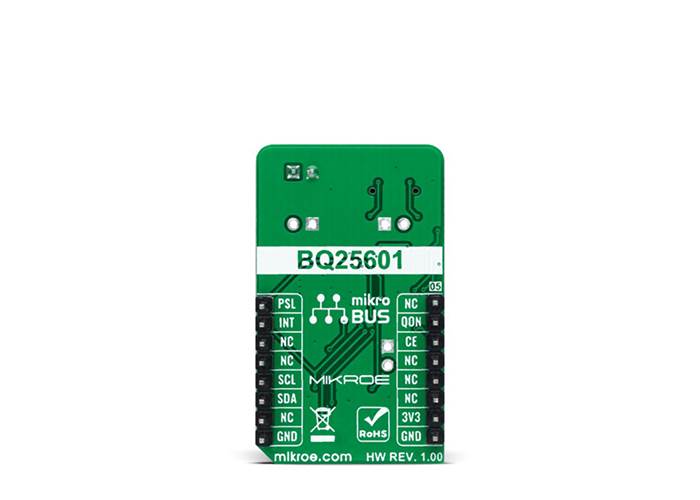 This Click board™ also uses two LED indicators, labelled as PG and STAT, used as power good and charging status indicator. PG indicates a good input source if the input voltage is above the SLEEP mode threshold and the current limit is above 30mA, while STAT reports the charging status and any fault conditions. CE pin routed to the CS pin on the mikroBUS™ socket enables battery charging process by setting this pin into a low logic state. PSEL pin routed to the PWM pin on the mikroBUS™ socket is used as a power source selection input and sets 500mA input current limit by pulling this pin high, otherwise set 2.4A input current limit by pulling this pin low. The BQ25601 also provides a QON pin, routed to the RST pin on the mikroBUS™ socket, for BATFET enable and reset control, to exit low-power mode or whole system reset function.