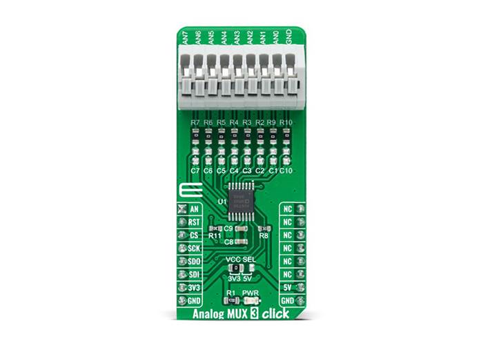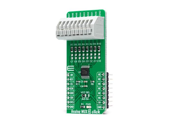 Each bit of the 8-bit serial word corresponds to one switch of the device. Internal switching channels are independently controlled by an individual bit, providing an option of having any, all, or none of the switches activated. All of the input channels of the multiplexer can be easily connected to a nine pole spring action block terminal, without having to use any additional tools, such as screwdrivers, while the output pin from the multiplexer is routed to the AN pin on the mikroBUS™ socket.