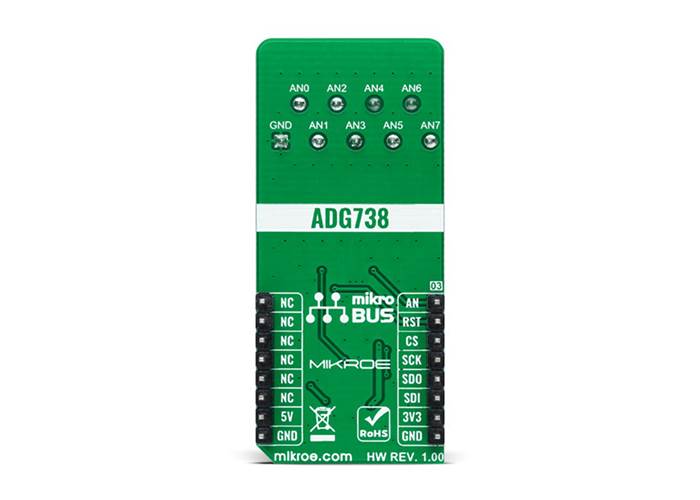 Analogue MUX 3 Click uses the ADG738, a CMOS 8-channel analogue matrix switch with a serially-controlled SPI interface from Analogue Devices. The ADG738 can operate equally well as either multiplexer, demultiplexer, or switch array, providing more flexibility. It also features a low on-resistance closely matched between switches and very flat over the entire signal range. During the Power-Up of the ADG738, all switching channels will be in the OFF condition, and the internal shift register will contain all zeros and remains so until a valid write takes place. All channels exhibit ‘break-before-make switching action preventing momentary shorting when switching channels.
