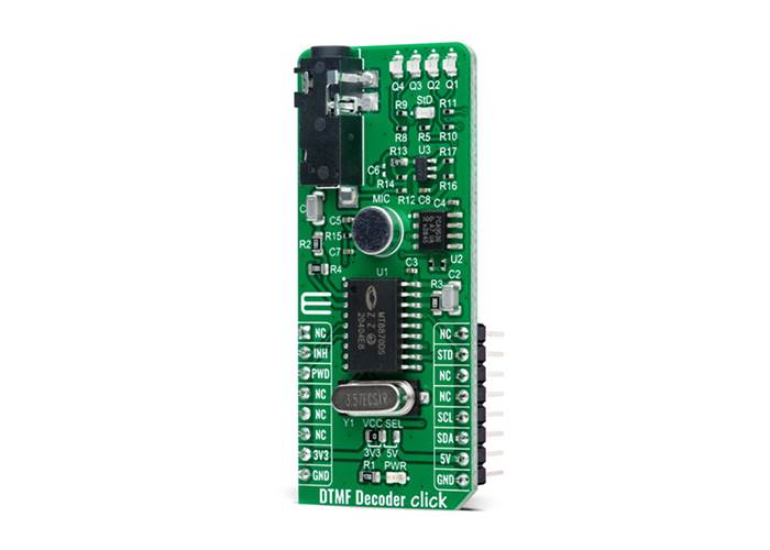 DTMF Decoder Click is a compact add-on board that contains an integrated DTMF receiver with enhanced sensitivity. This board features the MT8870D, a complete DTMF receiver integrating the band-split filter and digital decoder functions from Microchip Technology.