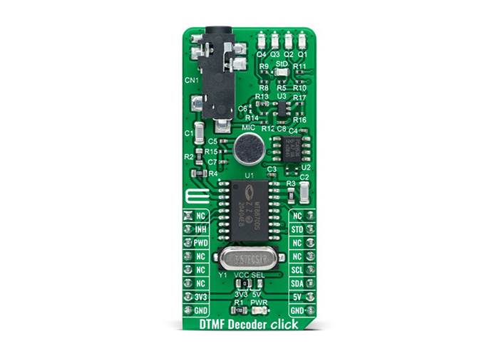 DTMF Decoder Click is a compact add-on board that contains an integrated DTMF receiver with enhanced sensitivity. This board features the MT8870D, a complete DTMF receiver integrating the band-split filter and digital decoder functions from Microchip Technology. It offers low power consumption and high performance and uses digital counting techniques to detect and decode all 16 DTMF tone-pairs into a 4-bit code. Whenever a valid tone is detected, it outputs the associated value in binary on four LEDs, with an additional indicator that strobes after each new tone. This Click board™ is suitable for paging systems, remote control, electronic communications circuits, and various other applications.