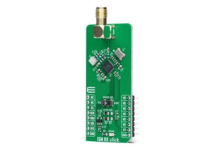 ISM RX Click is a compact add-on board that contains a complete wireless RF digital data receiver. This board features the MAX1471, a low-power CMOS RF dual-channel receiver configurable through SPI serial interface from Analogue Devices.