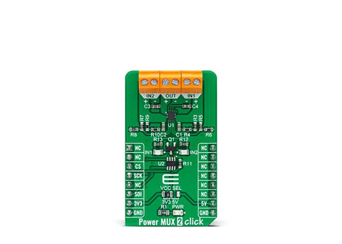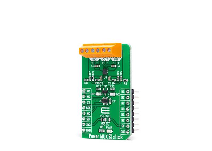 As an additional feature, this Click board™ also has two red LED indicators labelled as IN1 and IN2, which visually indicate to the user the fact which one of the two power supplies, IN1 or IN2, is located on the output more precisely on the output connector of the Click board™, labelled as OUT. This Click board™ can operate with both 3.3V and 5V logic voltage levels selected via the VCC SEL jumper. This way, it is allowed for both 3.3V and 5V capable MCUs to properly use the SPI communication lines. However, the Click board™ comes equipped with a library containing easy-to-use functions and an example code that can be used, as a reference, for further development.