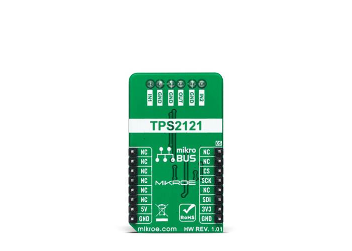 The Power MUX 2 Click communicates with MCU through the 3-Wire SPI serial interface using the TPL0501, an onboard 256-taps digital potentiometer from Texas Instruments. This way, the TPL0501 serves a current limiter that adjusts the output current of the TPS2120 instead of an external resistor. Current limiting can be used during Startup and switchover to protect against overcurrent events and protect the device during regular operation.