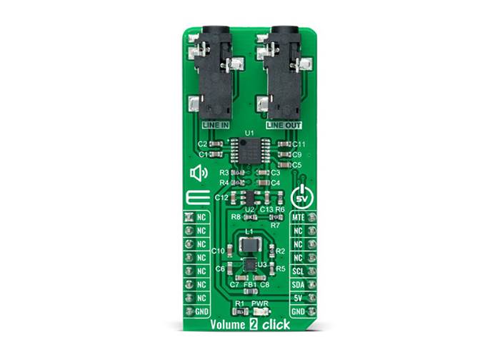Volume 2 Click is a compact add-on board that provides the user with complete digital volume control. This board features the NJU72341, a 2-channel I2C configurable electronic volume IC with external mute control from NJRC. It controls two independent low distortion audio channels with a vast volume control range from 0 to 95dB with 1dB step offering zero-cross detection to protect pop noise. It operates with a simple I2C serial interface that accepts 8-bit data offering low distortion and noise. This Click board™ is suitable for stereo and multi-channel audio systems and represents a perfect solution for remote audio volume control applications.