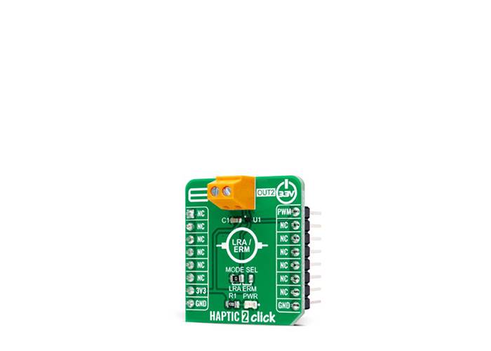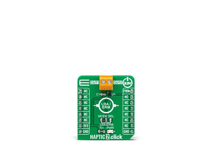 HAPTIC 2 Click operates only with the PWM signal from the mikroBUS™ socket that drives the LC898302AXA and offers fully configurable drive and brake functions. Also, it has a jumper setting available labelled as MODE SEL used to choose between LRA or ERM motor to drive.