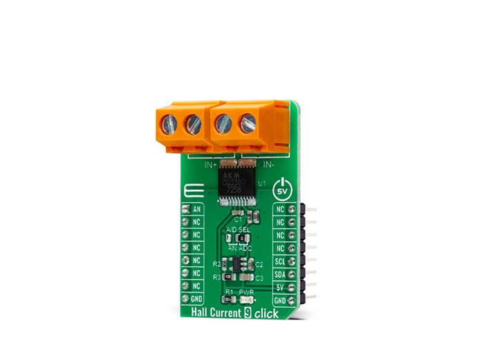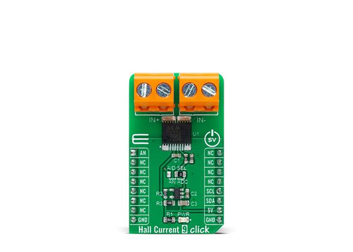 Hall Current 9 Click is a compact add-on board that provides a fast and precise solution for AC / DC current sensing. This board features the CQ3300, a high-speed response coreless current sensor using a Hall sensor that outputs the analogue voltage proportional to the AC/DC from AKM Semiconductor. It employs a high sensitive InAs (Indium Arsenide) Hall element with the ability to detect both DC and AC with high accuracy and high speed. It has an ultra-fast high response of 0.5μsec, high galvanic isolation, and it is designed for the currents to range from -6.4A to +6.4A. This Click board™ is suitable for overcurrent applications and shows good performance in small-sized inverter applications.