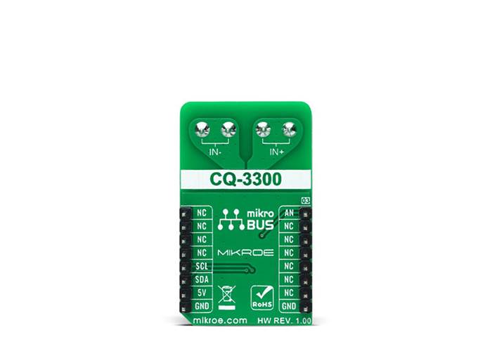 The CQ3300 has a ratiometric output that means it changes proportionally to the supply voltage. It is suitable for applications where the analogue output is converted to digital using an A/D converter and where fluctuation of the power supply voltage causes reference error of the A/D converter. Just like that, the output voltage can be converted to a digital value using MCP3221, a successive approximation A/D converter with a 12-bit resolution from Microchip, using a 2-wire I2C compatible interface, or can be sent directly to an analogue pin of the mikroBUS™ socket labelled as AN. Selection can be performed by onboard SMD jumper labelled as A/D SEL to an appropriate position marked as AN and ADC.