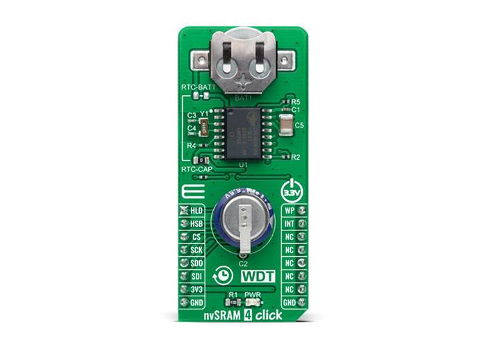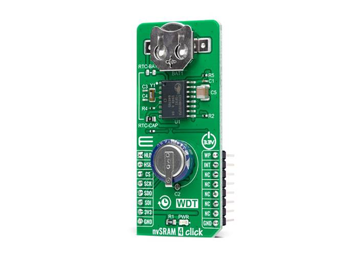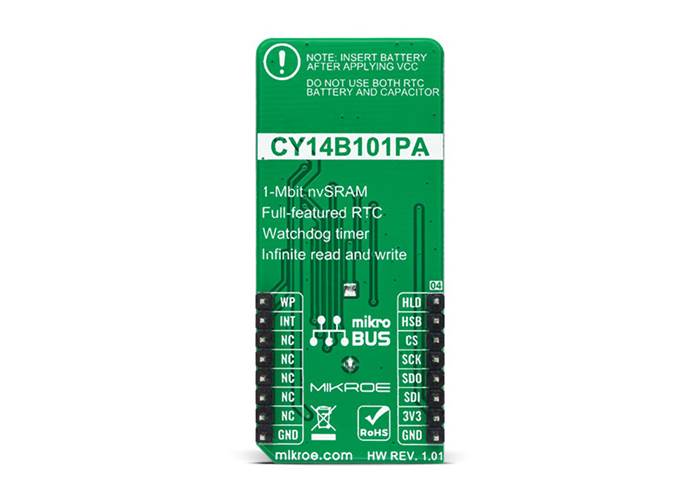 nvSRAM 4 Click is a compact add-on board that contains the most reliable nonvolatile memory. This board features the CY14B101PA, a 1-Mbit nvSRAM with a fully-featured real-time clock from Infineon. The memory is organised as 128K words of 8 bits each, where the embedded elements incorporate the QuantumTrap technology that provides highly reliable, nonvolatile data storage. It provides infinite read and writes cycles with an additional automatic backup switch. Data transfer, initiated by the user through SPI commands, takes place automatically at Power-Down. On the other hand, during the Power-Up, data is restored to the SRAM from the nonvolatile memory. This Click board™ is suitable for all applications that require fast access and high reliability of stored data, and unlimited endurance.
