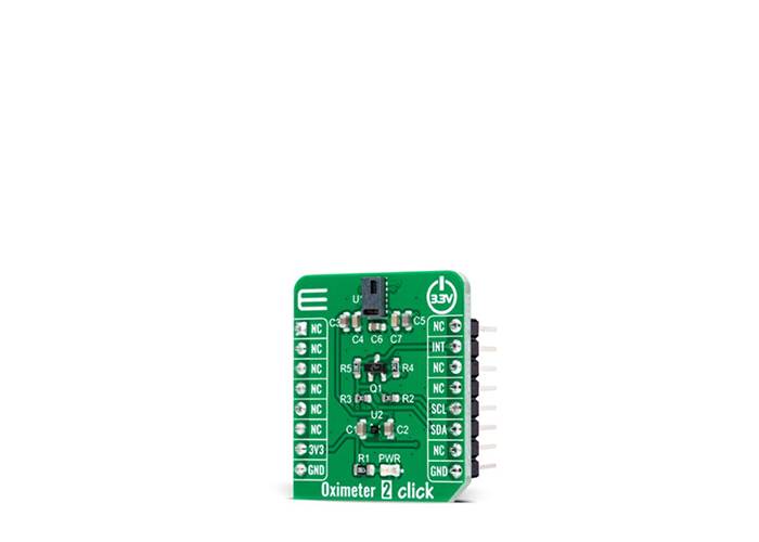 Oximeter 2 Click communicates with MCU using the standard I2C 2-Wire interface, with a typical clock frequency of 400kHz. A high-speed I2C interface allows data to be read from output registers directly or through a FIFO buffer. All register writes are single word only and require 16 bits of data. It also comes with a programmable interrupt line, labelled as INT and routed on the INT pin of the mikroBUS™ socket that simplifies timely data access. The ADPD144RI does not require a specific Power-Up sequence but requires a supply voltage of 1.8V in order to work properly. Therefore, a small regulating LDO is used, the ADP160 from Analogue Devices, providing a 1.8V out of 3.3V mikroBUS™ rail.