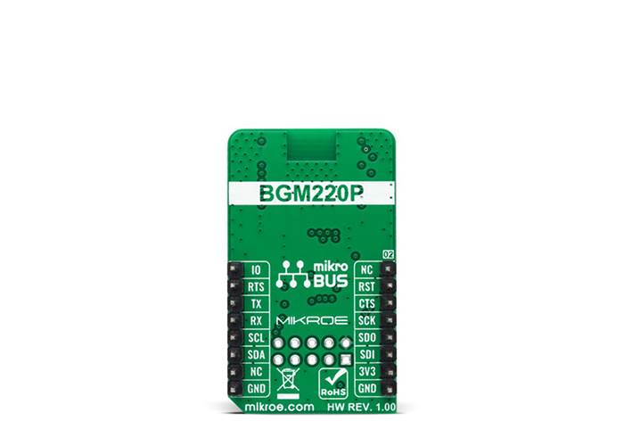 The EFR32BG22 SoC, inside the BGM220P module, includes an Arm Cortex-M33 processing core, up to 32Kb of RAM, up to 512kB of flash memory, and a 2.4GHz radio transceiver, offering up to 8dB output power. This Click board™ offers enhanced performance, security, and reliability to support IoT products running on Bluetooth networks.