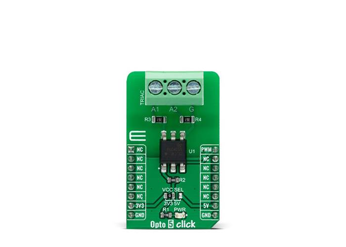 Opto 5 Click is a compact add-on board that provides uncomplicated safety isolation from the high voltage. This board features the FOD4216, a random phase snubberless Triac driver from ON Semiconductor. The FOD4216 consists of an infrared emitting diode coupled to a hybrid random phase triac formed with two inverse parallel SCRs, which creates the triac function capable of driving discrete triacs. It utilizes a high efficiency infrared emitting diode that offers an improved trigger sensitivity. This Click board™ is suitable for applications like high voltage AC switching where there is a need to protect and electrically isolate two circuits in a switching application.