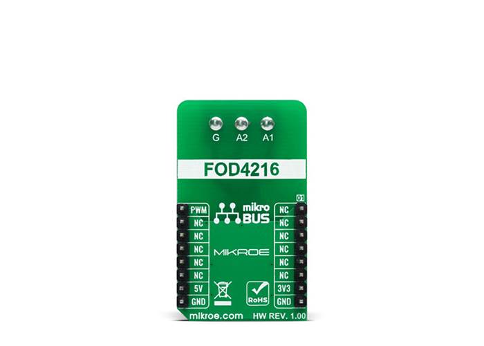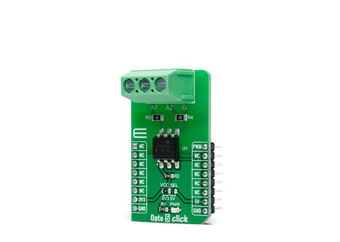 Opto 5 Click operates only with the PWM signal from the mikroBUS™ socket that drives the cathode of the FOD4216. In applications when hot-line switching is required, the “hot” side of the line is switched, and the load is connected to the cold or neutral side. In the case of a Standard Triac usage, the user should add a 39Ω resistor and 0.01uF capacitor parallel to triac terminals A1 and A2 used for snubbing of the triac. While in the case of highly inductive loads where the power factor is lower than 0.5), the value of a resistor should be 360Ω. In the case of use Snubberless Triac usage, there is no need for these components.