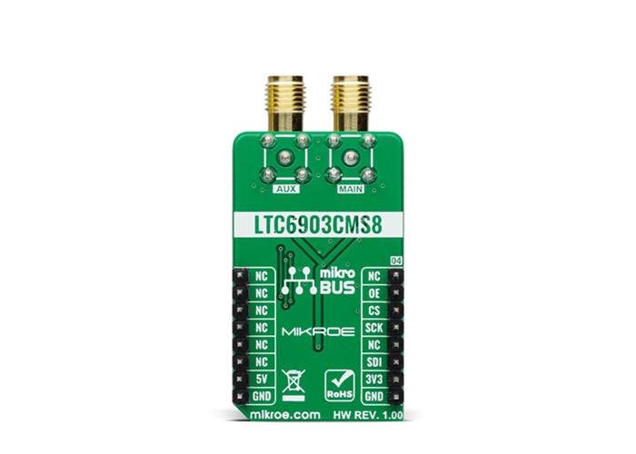 Clock Gen 5 Click is a compact add-on board that contains a digital programmable oscillator solution. This board features the LTC6903, a low-power self-contained digital frequency source providing a precision frequency from 1kHz to 68MHz set through a 3-wire SPI digital interface from Analogue Devices. The LTC6903 features a proprietary feedback loop that linearizes the relationship between digital control setting and frequency and provides a smaller, more reliable, and vastly more versatile clocking solution. The frequency between 1kHz and 68MHz is set by a 16-bit control word, typically accurate within 1.1% with a resolution of 0.1% or better. This Click board™ is suitable for applications such as MCU clock source, clock source for a switched capacitor filter, or general replacement for a DAC/VCO combination.