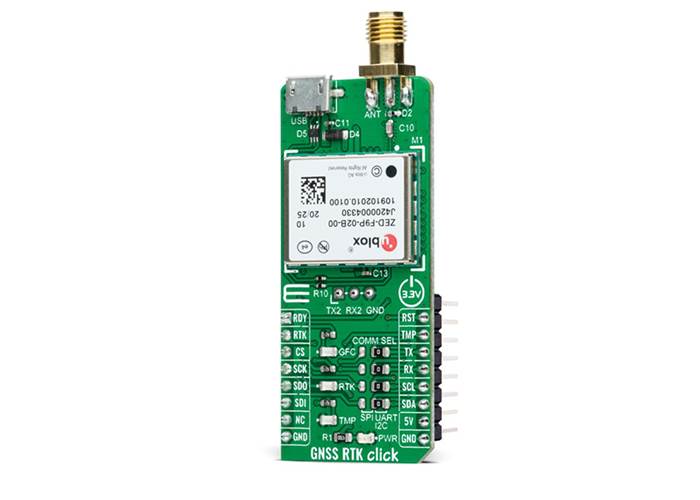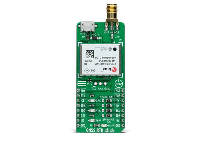 GNSS RTK Click is a compact add-on board used to enhance the precision of position data derived from satellite-based positioning systems.