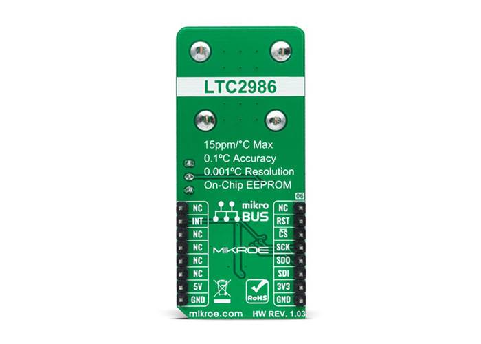 Temp Probe Click is a compact add-on board used as thermocouple temperature monitoring system. This board features the LTC2986, a high accuracy digital temperature measurement system used to directly digitise thermocouples with 0.1°C accuracy and 0.001°C resolution from Analogue Devices.
