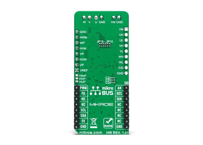 In addition to I2C communication, several GPIO pins connected to the mikroBUS™ socket pins are also used. The DIR pin, routed on the CS pin of the mikroBUS™ socket, is used to select the direction of motor rotation, while the control of the motor rotation speed itself can be chosen via the VSP SEL jumper. With this jumper, the user has the option of the rotation speed control using a PWM signal or using a value obtained by the DAC43608. The pin marked with RES routed at the RST pin of the mikroBUS™ socket can be used for Error detection more precisely for enabling or disabling commutation outputs. The FG pin at the INT pin of the mikroBUS™ socket represents the rotating pulse based on the selectable number of pulses per revolution. And the last pin labelled as AN provides accurate current monitoring via LT1999-10, a high-voltage, bidirectional current sense amplifier from Analogue Devices.