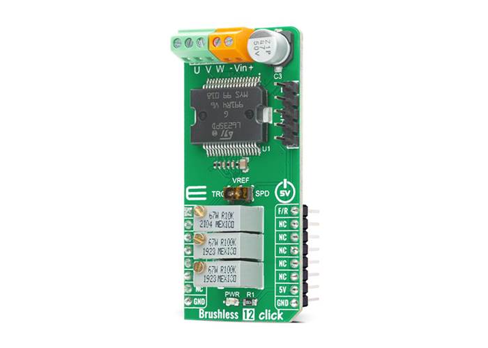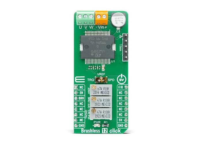 Brushless 12 Click is based on the L6235, fully integrated motor driver specifically developed to drive a wide range of BLDC motors with Hall effect sensors from STMicroelectronics. The L6235 includes a 3-phase DMOS bridge, an OFF-TIME PWM current controller, and the decoding logic for single-ended Hall sensors that generate the required sequence for the power stage, and other added features for safe operation and flexibility. It also has a built-in Over Current Detection (OCD) that allows protection against short circuits between the outputs and between output and ground.