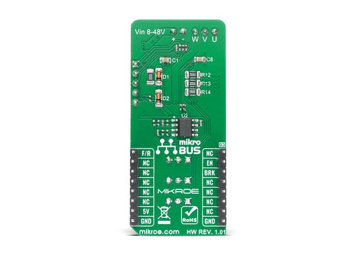 Brushless 12 Click communicates with MCU using several GPIO pins. The RST pin of the mikroBUS™ socket labelled as EN represents the Enable function and serves as Chip Enable that turns OFF all power MOSFETs of the L6235. CS pin labelled as BRK switches ON all high-side power MOSFETs and allows the user to use the brake function. And the last GPIO pin routed to the PWM pin of the mikroBUS™ socket labelled as F/R selects the direction of the motor rotation. It also possesses two connectors, where one of them represents an external power supply labelled as VIN in the range from 8 to 48V maximum, and the next one labelled with U V W is a terminal on which the BLDC motor needs to be connected.
